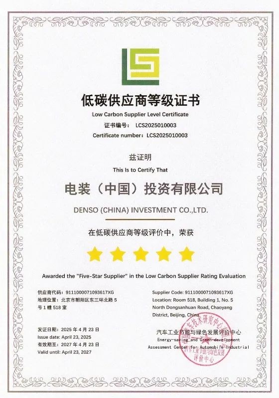 2025年4月23日,电装(中国)投资有限公司(以下简称“电装中国”)荣获由汽车工业节能与绿色发展评价中心颁发的“五星低碳供应商”等级证书。这一认证充分肯定了电装中国在碳管理体系建设、节能降碳实践以及绿色供应链协同方面的积极成效,彰显了电装作为汽车零部件供应商在“双碳”目标下的责任担当。